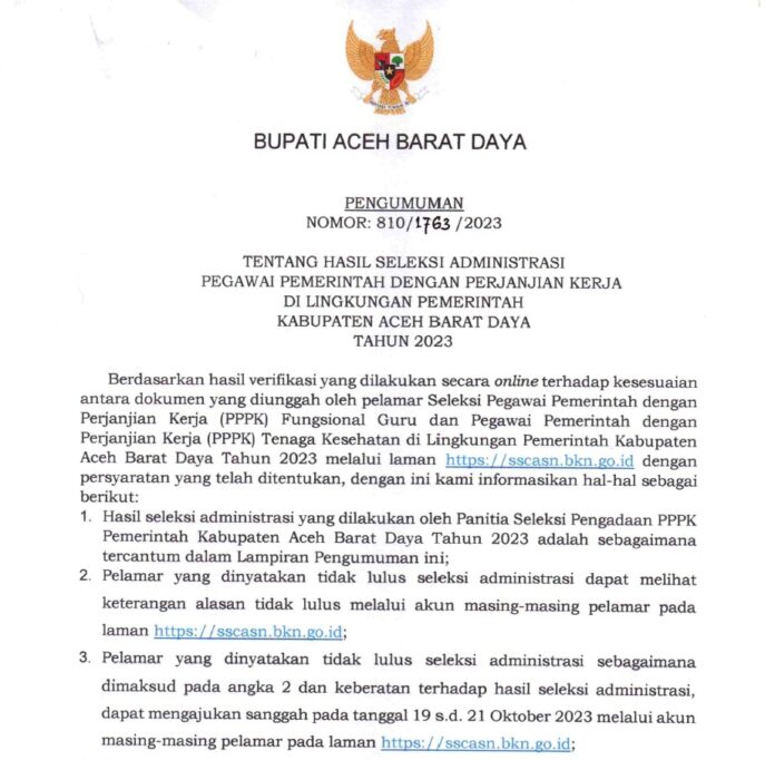 Hal tersebut disampaikan dalam Pengumuman Bupati Aceh Barat Daya Nomor: 810/1763/2023 tentang Hasil Seleksi Administrasi Pegawai Pemerintah dengan Perjanjian Kerja di Lingkungan Pemerintah Aceh Barat Daya Tahun 2023.