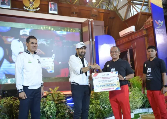 NUKILAN.ID | BANDA ACEH – Pemerintah Aceh resmi mencairkan bonus bagi atlet dan pelatih peraih medali pada Pekan Olahraga Nasional (PON) XXI/2024 Aceh–Sumut. Penyerahan berlangsung dalam acara Penganugerahan Penghargaan Olahraga di Anjong Mon Mata, Kompleks Meuligoe Gubernur Aceh, Jumat (14/11/2025) malam.