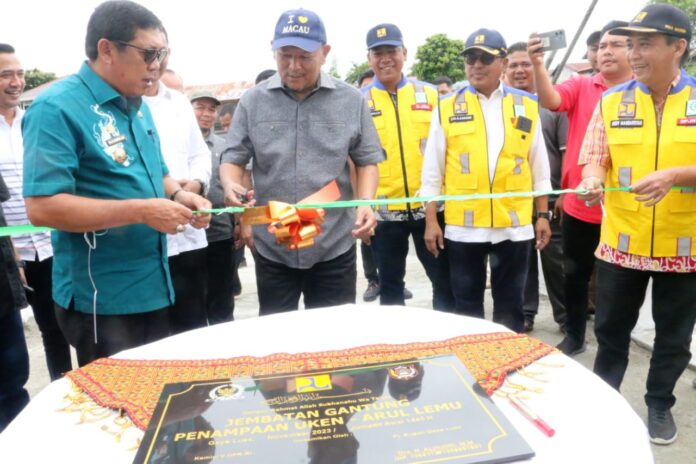 Nukilan.id – Pj Bupati Gayo Lues Drs. H. Alhudri, M.M dan Anggota DPR RI F-PKB H. Irmawan, bersama-sama meresmikan jembatan gantung Penampaan Uken Arul Lemu, Belangkejeren, Gayo Lues, pada Jum’at (24/11/2023).