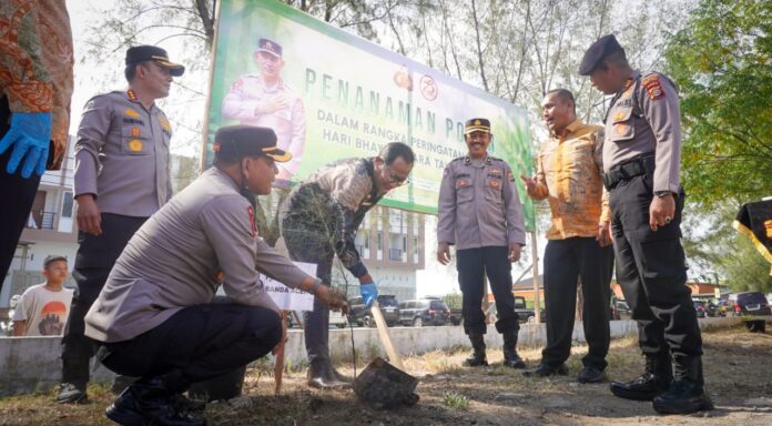 NUKILAN.id | Banda Aceh – Pj Wali Kota Banda Aceh yang diwakili oleh Asisten Perekonomian dan Pembangunan Kota Banda Aceh Fadhil, S.Sos, MM mengikuti penanaman pohon pada kegiatan Bakti Sosial dalam rangka Hari Bhayangkara Ke-78 di Pasar Al-Mahira Lamdingin, Kecamatan Kuta Alam, Banda Aceh, Kamis (27/06/2024).