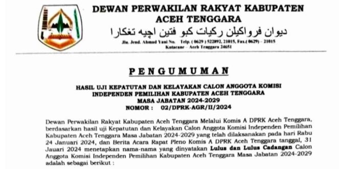 Penetapan lima Komisioner ini diumumkan melalui Pengumuman Nomor: 02/DPRK-AGR/II/2024 yang ditandatangani oleh Ketua DPRK Aceh Tenggara, Denny Febrian Roza tertanggal 12 Februari 2024.