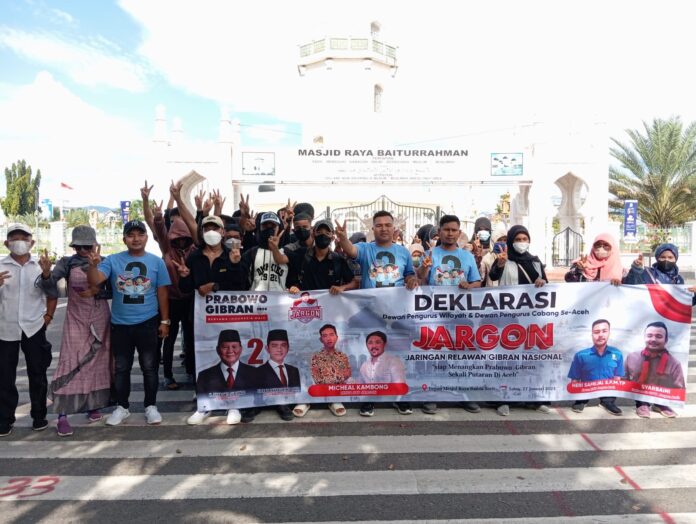 Nukilan.id – Jaringan Relawan Gibran Nasional (Jarkgon) DPW Provinsi Aceh menggelar deklarasi Akbar di depan Masjid Raya Kota Banda Aceh, pada Sabtu 27 Januari 2024. Acara ini dihadiri oleh 200 relawan yang berkomitmen untuk menyukseskan Prabowo Gibran di Aceh.