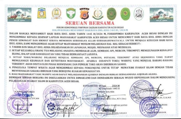 Seruan Bersama ini diharapkan dapat meningkatkan kebersamaan dan kekhusyukan umat muslim dalam merayakan Idul Adha, serta menjaga keharmonisan lingkungan di Aceh Besar.
