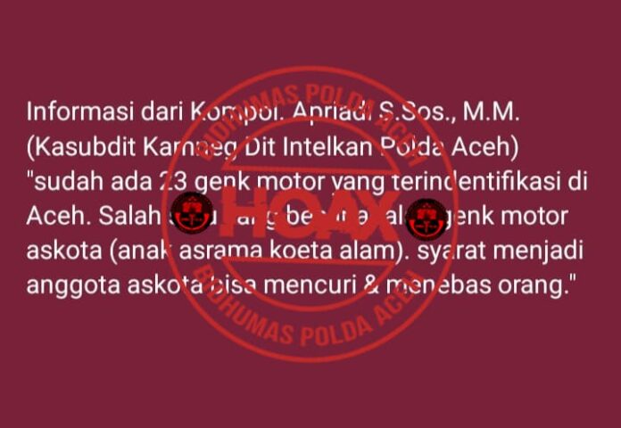 Nukilan.id – Beredarnya pesan WhatsApp yang menyebutkan teridentifikasinya 23 geng motor di Aceh dan disertakan nama seorang personel polri dari Polda Aceh membuat resah masyarakat. Kabid Humas Polda Aceh, Kombes Joko Krisdiyanto, menegaskan bahwa informasi tersebut adalah hoaks.