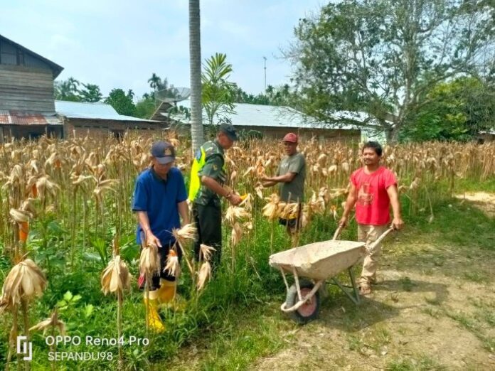 Jaga Ketahanan Pangan, Babinsa Koramil di Aceh Tamiang Bantu Petani Panen Jagung