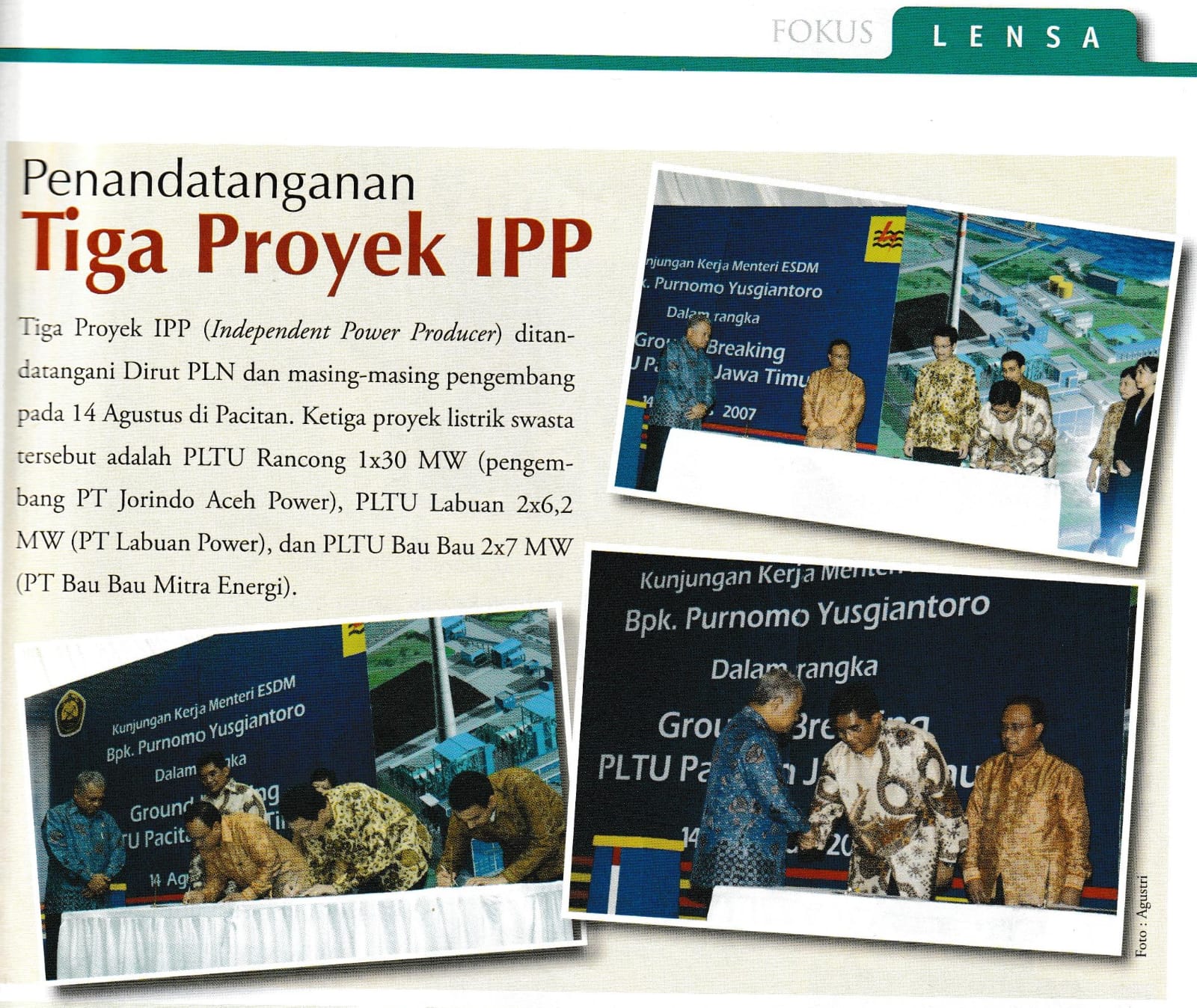 Ia menambahkan, pada 14 Agustus 2007 telah dilakukan penandatanganan Power Purchase Agreement (PPA) bersamaan dengan acara groundbreaking PLTU Pacitan di Jawa Timur.