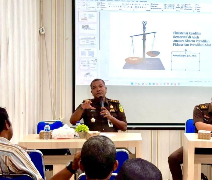 Sementara itu, Kasubsidik Pidsus Kejaksaan Negeri Banda Aceh, Asmadi Syam memberikan materi tentang Restorative Justice dan Lembaga Peradilan Adat di Aceh.