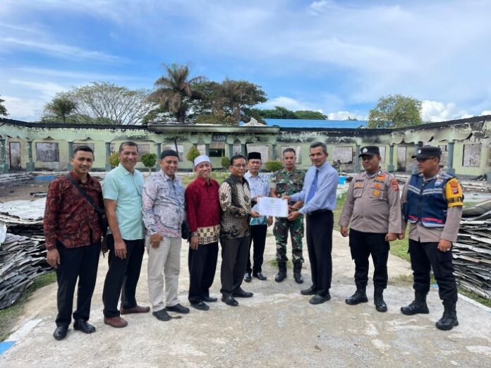 Nukilan.id – Kepala Bidang Pendidikan Diniyah dan Pondok Pesantren (PD Pontren) Kantor Wilayah Kementerian Agama Provinsi Aceg Dr H Muntasyir SAg MA mewakili Kakanwil Kemenag Aceh Drs H Azhari menyerahkan bantuan masa panik kepada korban kebakaran Pondok Pesantren Modern Gontor 8 Aceh, Gampong Meunasah Baro, Kecamatan Seulimuem. Kamis 24 Agustus 2023.