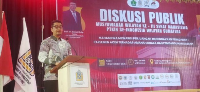 NUKILAN.ID | LHOSEUMAWE — Kepala Badan Pengembangan Sumber Daya Manusia (BPSDM) Aceh, Marthunis, ST, DEA, menghadiri sekaligus membuka secara resmi Musyawarah Wilayah (Muswil) Senat Mahasiswa Perguruan Tinggi Keagamaan Islam Negeri (PTKIN) ke-III se-Sumatera. Ia hadir mewakili Gubernur Aceh, Muzakir Manaf. Kegiatan ini dipusatkan di Gedung Serbaguna Universitas Islam Negeri (UIN) Sultanah Nahrasiyah Aceh, Rabu (12/11).