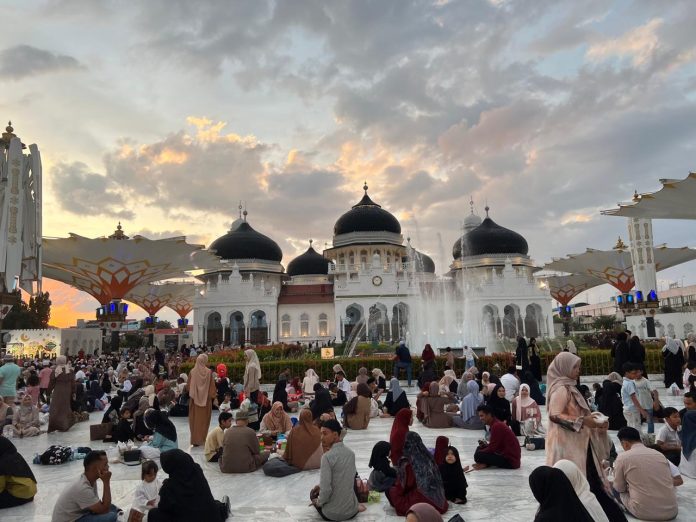 NUKILAN.id | Feature – Langit senja di Kota Banda Aceh perlahan berubah jingga ketika azan Magrib masih menunggu beberapa menit lagi. Di pelataran Masjid Raya Baiturrahman, ratusan warga telah lebih dulu memadati area halaman. Sebagian duduk beralas sajadah, lainnya menggelar tikar sederhana, membentuk lingkaran-lingkaran kecil bersama keluarga.