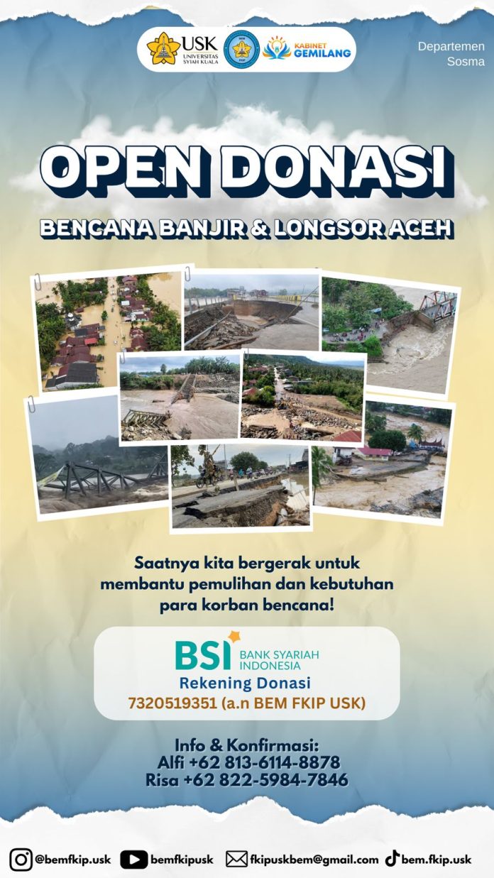 Rekening Donasi: Bank Syariah Indonesia (BSI): 7320519351 a.n. BEM FKIP USK