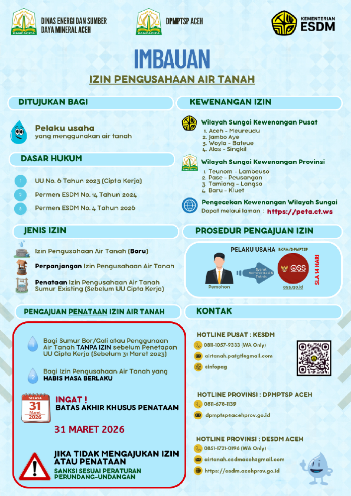 Pemerintah Aceh juga menetapkan batas akhir pengajuan penataan izin penggunaan air tanah hingga 31 Maret 2026.