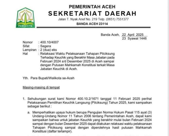 “Untuk jabatan keuchik yang berakhir mulai bulan Februari 2024 sampai dengan bulan Desember 2025, dapat dilakukan relaksasi waktu pelaksanaan tahapan Pilchiksung sampai dengan diperolehnya hasil putusan Mahkamah Konstitusi,” demikian isi utama surat edaran tersebut.