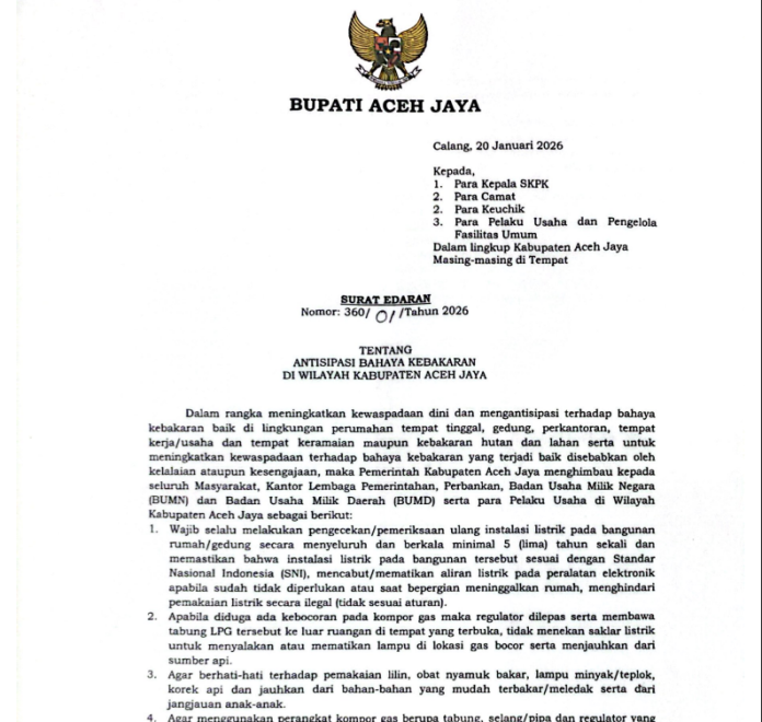 NUKILAN.ID | Calang – Pemerintah Kabupaten Aceh Jaya mengeluarkan Surat Edaran Bupati Nomor 360/01/2026 tertanggal 20 Januari 2026 sebagai langkah antisipasi terhadap potensi kebakaran sepanjang tahun 2026. Edaran tersebut ditujukan kepada seluruh perangkat daerah, camat, keuchik, serta unsur terkait di Aceh Jaya.
