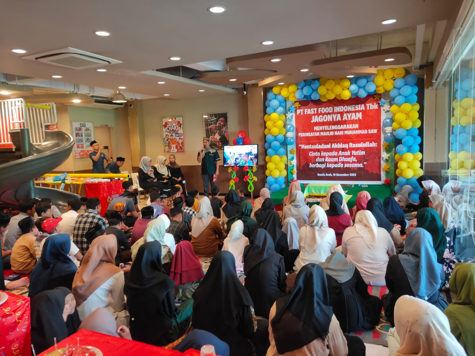 Nukilan.id – KFC Banda Aceh menyantuni ratusan anak yatim dalam rangka peringatan Maulid Nabi Muhammad SAW. Acara ini berlangsung di KFC Simpang Lima, daerah setempat, pada Sabtu (16/12/2023).