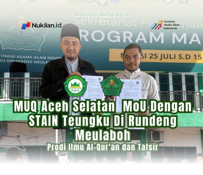 NUKILAN.ID | TAPAKTUAN – Pesantren MUQ Aceh Selatan resmi menjalin kerja sama dengan Program Studi Ilmu Al-Qur’an dan Tafsir Sekolah Tinggi Agama Islam Negeri (STAIN) Teungku Dirundeng Meulaboh, Aceh Barat, Selasa (10/3/2026).