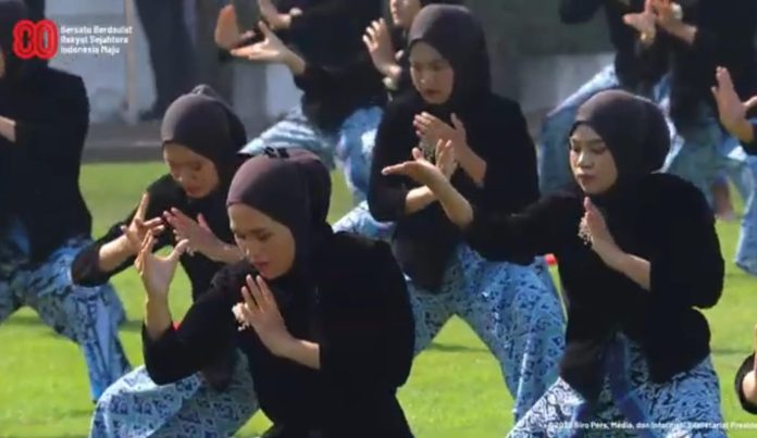 NUKILAN.ID | JAKARTA – Perayaan Hari Ulang Tahun (HUT) ke-80 Republik Indonesia di Istana Merdeka, Minggu (17/8/2025), dimeriahkan penampilan memukau para pesilat perempuan. Dengan balutan baju hitam dan celana silat bermotif batik mega mendung bernuansa biru, mereka menampilkan keindahan gerakan pencak silat di hadapan para tamu negara.
