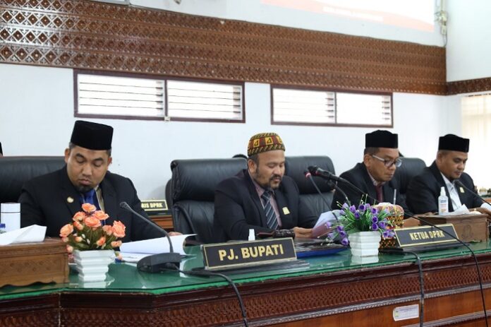 Nukilan.id – Penjabat (Pj) Bupati Aceh Besar Muhammad Iswanto, S.STP MM menyampaikan Rancangan Kebijakan Umum Anggaran (KUA) dan Rancangan Prioritas dan Plafon Anggaran Sementara (PPAS) Anggaran Pendapatan dan Belanja Kabupaten Aceh Besar Tahun Anggaran 2024 dalam Rapat Paripurna ke-7 Dewan Perwakilan Rakyat Kabupaten (DPRK) Aceh Besar Masa Persidangan ke-3 tahun sidang 2022-2023 di Gedung DPRK Aceh Besar, Rabu (9/8/2023).
