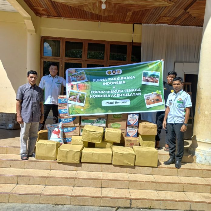 NUKILAN.ID | TAPAKTUAN – Purna Paskibraka Indonesia bekerja sama dengan Forum Diskusi Tenaga Honorer Kabupaten Aceh Selatan menyerahkan bantuan sembako bagi korban banjir di Kabupaten Pidie Jaya. Penyerahan bantuan dilakukan secara simbolis di Sekretariat Daerah Kabupaten Aceh Selatan sebagai bentuk kepedulian terhadap masyarakat terdampak bencana.