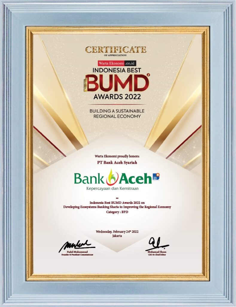 Nukilan.id – Mengawali tahun 2022, Bank Aceh berhasil meraih penghargaan Indonesia Best BUMD Awards 2022 bertajuk Building a Sustainable Regional Economy kategori BPD dengan menyandang predikat Indonesia Best BUMD Awards 2022 on Developing Ecosystems Banking Sharia to Improving The Regional Economy. Penghargaan tersebut diserahkan langsung Edy Nurmansyah, Business Director Warta Ekonomi kepada Direktur Utama Bank Aceh, Haizir Sulaiman didampingi oleh Ziad Farhad, Humas Bank Aceh, Kamis (24/02) melalui aplikasi zoom.