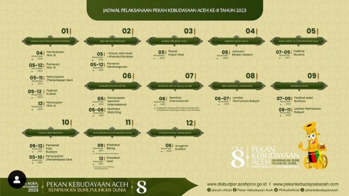 Nukilan.id – Ajang Pekan kebudayaan Aceh (PKA) ke-8 Tahun 2023 sudah dibuka sejak Sabtu (4/11/2023) malam lalu. Berbagai acara dan perlombaan diadakan untuk menyemarakkan ajang lima tahunan ini di beberapa titik lokasi di Kota Banda Aceh sejak 4-12 November 2023.