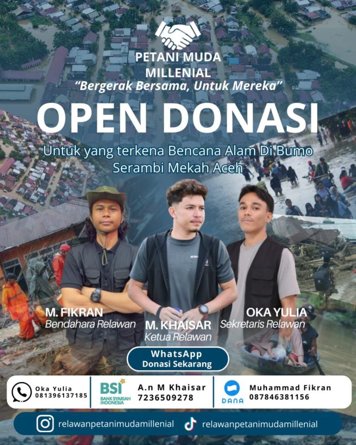 NUKILAN.ID | BANDA ACEH – Relawan Petani Muda Millenial (RPMM) kembali membuka program open donasi dalam rangka aksi pemuda peduli bencana alam Aceh 2025. Kegiatan ini diumumkan langsung oleh Sekretaris RPMM, Oka Yulia atau yang akrab disapa Acong, melalui akun Instagram resmi @relawanpetanimillenial.