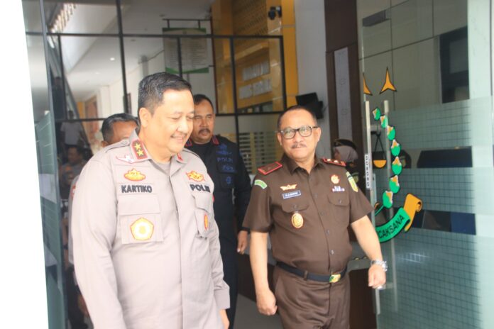 Nukilan.id — Kapolda Aceh Irjen Achmad Kartiko menyambagi Kepala Kejaksaan Tinggi (Kajati) Aceh Bambang Bachtiar di Kantor Kejati Aceh di Batoh, Kota Banda Aceh, Selasa, 10 Oktober 2023.