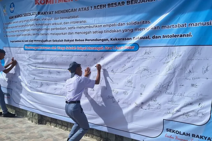 NUKILAN.ID | BANDA ACEH – Sekolah Rakyat Menengah Atas (SRMA) 1 Aceh Besar, Sentra Darussa’adah, menggelar ikrar bersama untuk mencegah perundungan di lingkungan sekolah, Senin (8/9/2025).