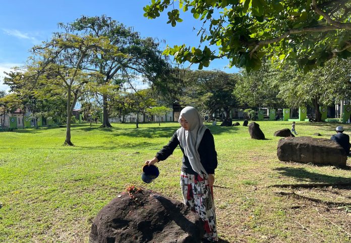 Di kawasan kuburan massal Ulee Lheue, tak ada nisan yang menyebut nama. Hanya batu-batu besar yang terdiam di atas hamparan rumput hijau, menjadi saksi ribuan nyawa yang tak sempat dikenali. Di salah satu batu itulah Reka, warga Lamgugob, menaburkan bunga, Jumat (26/12/2025), dalam hening yang sarat makna.