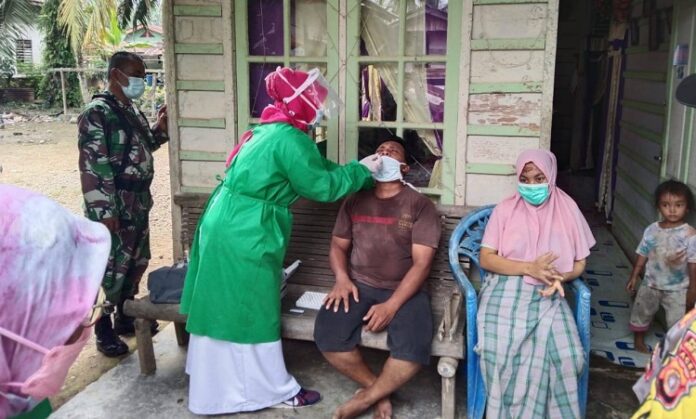 Nukilan.id – Tim Satgas Covid-19 bersama Komandan Pos Ramil Tenggulun, Koramil 07/Kejuruan Muda, Kodim 0117/Aceh Tamiang, Pelda M. Wahidin memonitor kegiatan tracing terhadap keluarga yang terindikasi terpapar virus Covid-19 yang kontak erat dengan Pasien Covid-19 di Dusun Lama, Desa Tenggulun, Kecamatan Tenggulun, Kabupaten Aceh Tamiang, Rabu (8/9/2021).