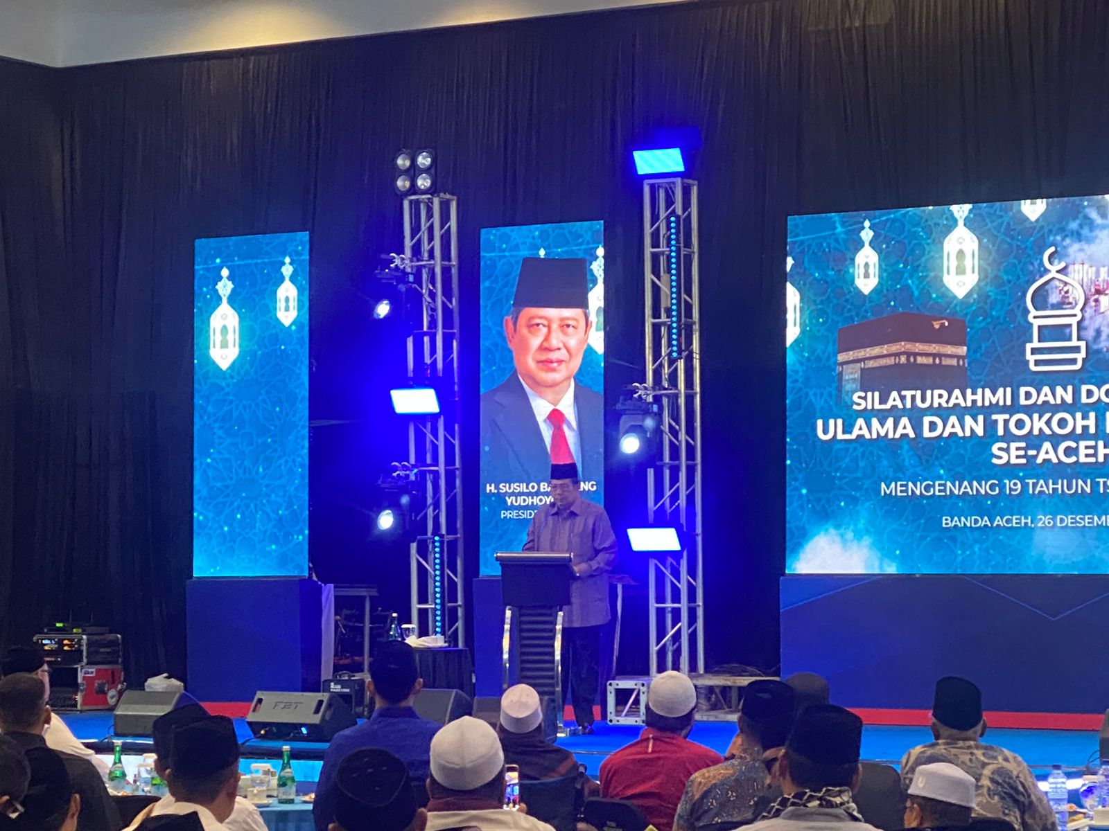 Nukilan.id – Presiden RI ke-6, Susilo Bambang Yudhoyono (SBY), mengadakan silaturahmi dengan ulama dan tokoh masyarakat se-Aceh di Banda Aceh. Pada acara tersebut juga dilakukan doa bersama untuk mengenang musibah tsunami Aceh yang ke-19.