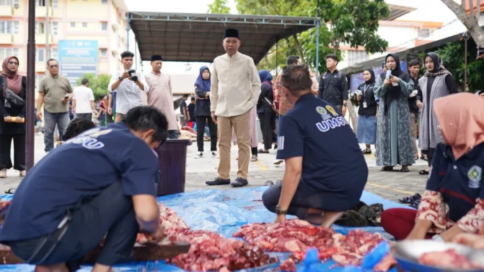 NUKILAN.id | Medan – Universitas Muhammadiyah Sumatera Utara (UMSU) kembali menunjukkan komitmennya dalam berbagi dengan masyarakat. Pada Senin (17/6/2024), UMSU menyembelih 60 ekor hewan kurban di kampus utama yang terletak di Jalan Mukhtar Basri, Kota Medan. Sebanyak 41 ekor disembelih di kampus utama, sementara 19 ekor lainnya didistribusikan ke masyarakat sekitar kampus serta beberapa daerah di Kota Medan, Kabupaten Langkat, Kabupaten Pakpak Barat, Kabupaten Deliserdang, hingga Provinsi Aceh.