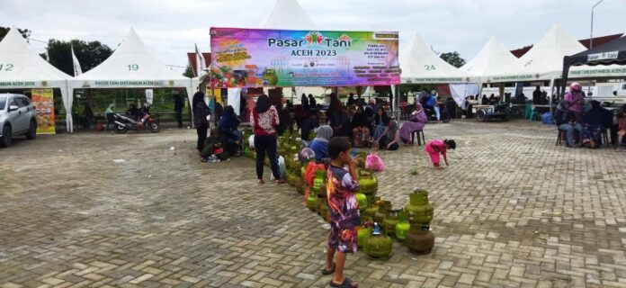 Nukilan.id – Sejumlah warga terlihat mengantri di lokasi Pasar Tani 2023 depan Dinas Pertanian dan Perkebunan Aceh, Lampineung, Banda Aceh untuk mendapatkan tabung gas elpiji subsidi 3 kilogram, Rabu (13/12/2023).